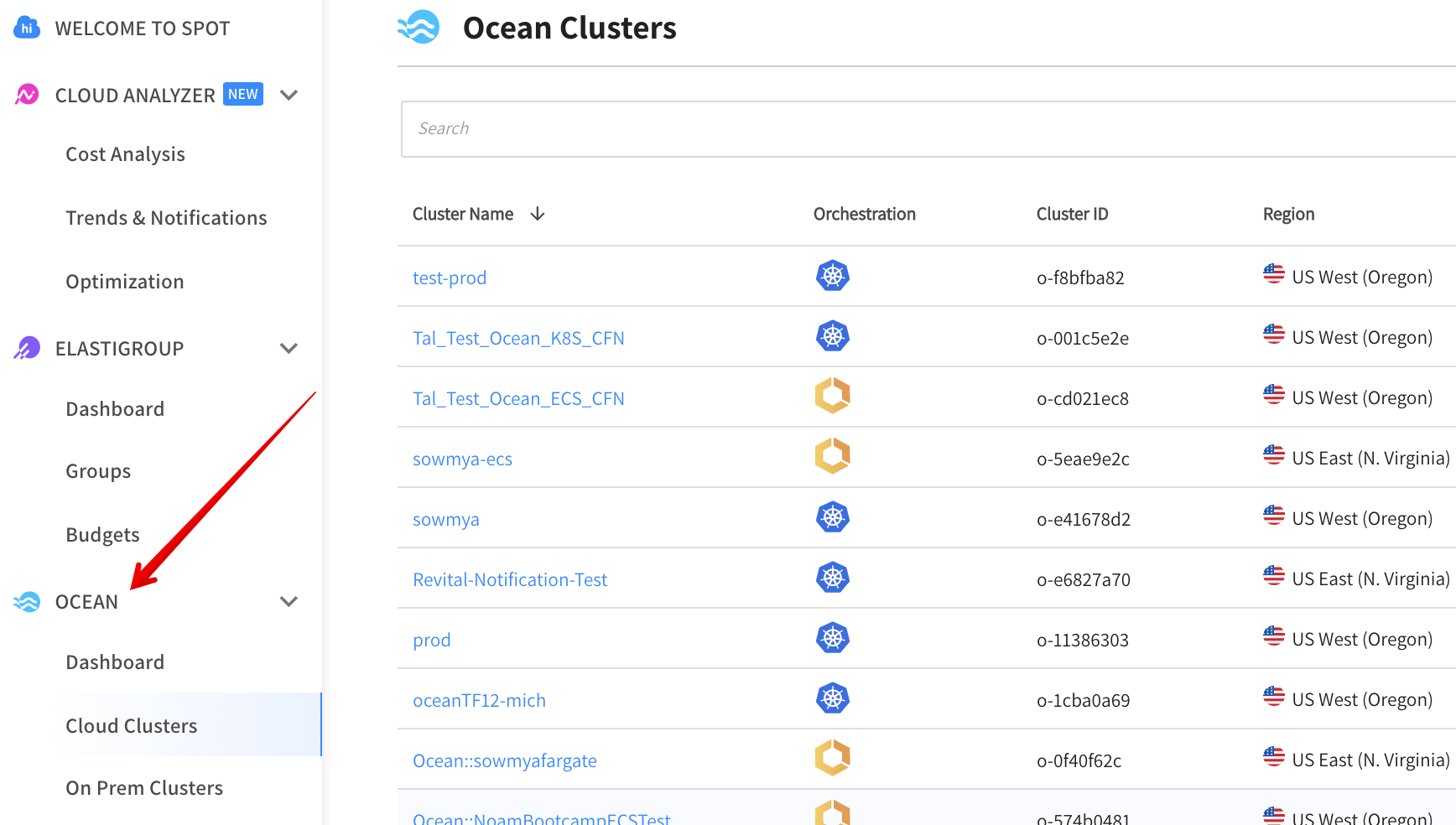 The Ocean internal architecture utilizes the Elastigroup engine, a core component of the Spot platform. Therefore, whenever an Ocean cluster is created, an underlying Elastigroup is also created. Although this underlying Elastigroup still appears in the Elastigroup area of the Spot console, management of the Ocean cluster is not allowed there. The cluster is managed only in the Ocean area of the console.