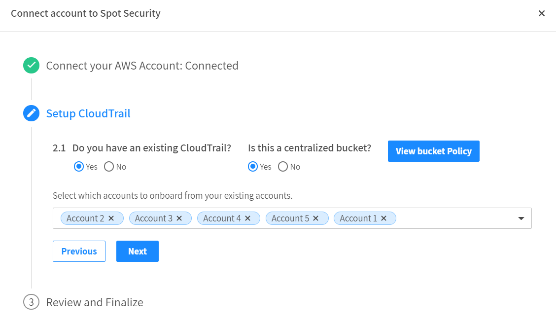 You can connect all the dependent accounts in bulk if you have selected a centralized bucket. Select all the accounts you wish to onboard and click Next.